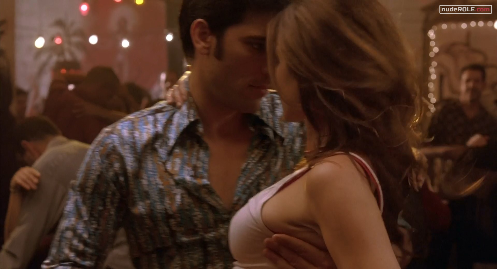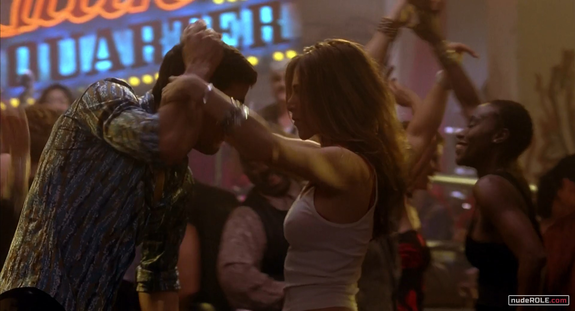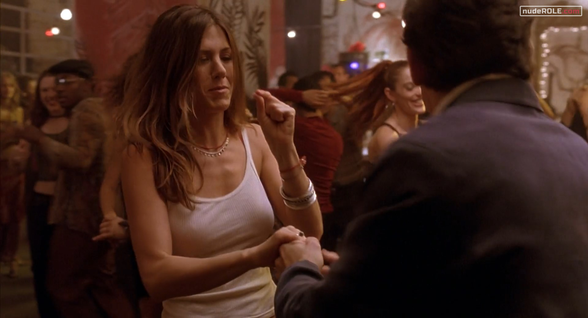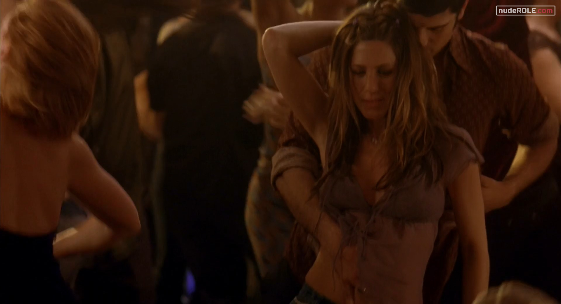 Jennifer Aniston as Polly Prince plays sexy in the comedy-romance film “Along Came Polly”, wich premiered in 2004. She showed cleavage and figure in a bikini. You can find side view of her boobs.